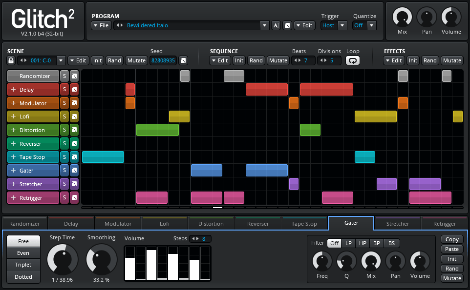 Die GUI (Abkürzung für Graphical User Interface - Deutsch: grafische Benutzeroberfläche) ist gelungen. Selbst Einsteiger sollten sich hier durch Ausprobieren, schnell zurecht finden. In Version 2.1 wurde noch etwas feinarbeit geleistet sowie Verbesserungen beim Gater vorgenommen. Ab Version 2.1 sind auch drei unterschiedliche Trigger Varianten möglich (Host, Gate und Latch). Das Update bringt also mehr als nur kosmetische Änderung und Besitzer von Glitch 2 erhalten ein paar neue Optionen.
