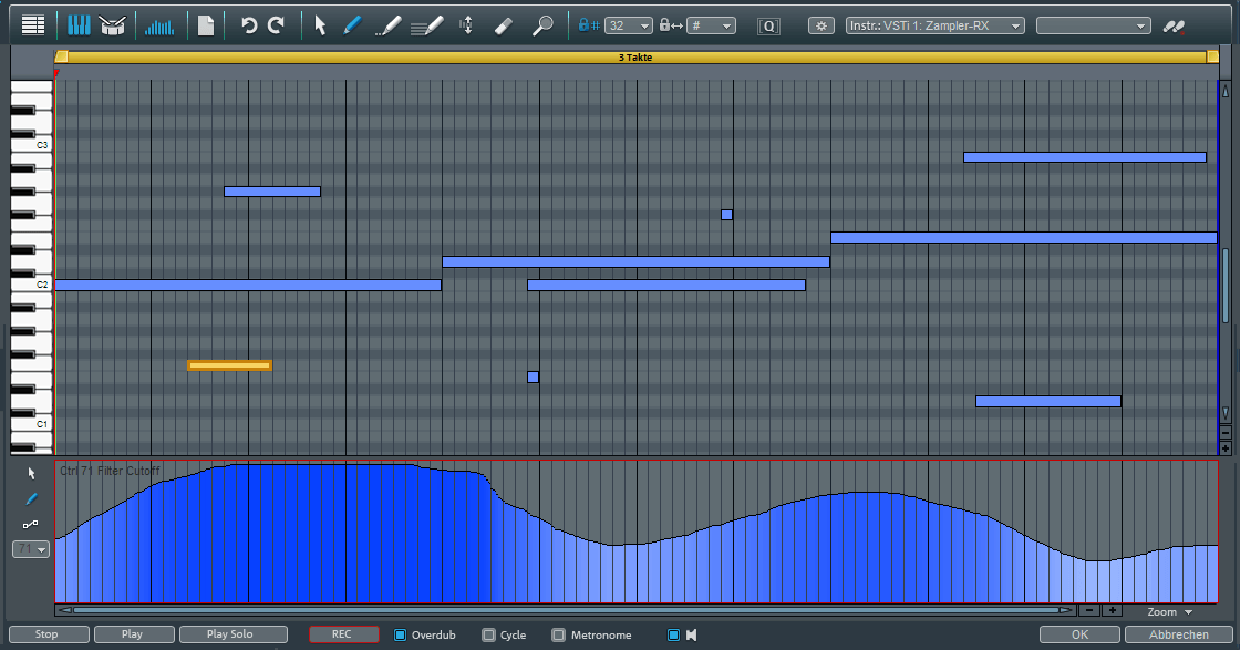 Mit dem vollwertigen Midi Editor lassen sich virtuelle und externe Instrumente gezielt und umfangreich ansteuern. In diesem Tutorial habe ich dies anhand des Revolta Synthesizers (Bestandteil der Premium Version) dokumentiert. Mit dem Midi Editor können natürlich auch Drums programmiert (Drum Editor Modus) werden. Der Zugriff auf alle wichtigen Parameter zur Steuerung von Synthesizern und anderen Instrumenten erweitert das Spektrum der Anwendungsmöglichkeiten innerhalb vom Music Maker enorm.