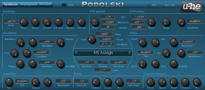 Die Berliner Synthesizer Entwickler u-he sind bekannt für ihre guten Plugins und bieten ebenfalls einen kostenlosen Synthesizer namens Podolski auf ihrer Webseite an. Obwohl Podolski im Vergleich zu anderen Synthesizern vermeintlich mager ausgestattet ist (nur jeweils ein Oszillator, Filter und Envelope sowie zwei LFOs, Arpeggiator, Delay und Chorus/Flanger Effekt), lassen sich damit durchaus gute Sounds herausholen. Podolski klingt sehr gut und die enthaltenen Presets (schnell erreichbar via Preset Browser) unterstreichen den guten Klangeindruck nochmals. Zudem verbraucht dieses Plugin erfreulich wenig CPU-Power und der Arpeggiator bietet ausreichend Potential für abwechslungsreiche Sequenzen. Podolski ist ein gutes Beispiel, dass man für gute Sounds nicht immer 1000 Funktionen benötigt, um einen gewünschten Sound zu erhalten. Kostenlos für PC und MAC zum Herunterladen auf der u-he Webseite.